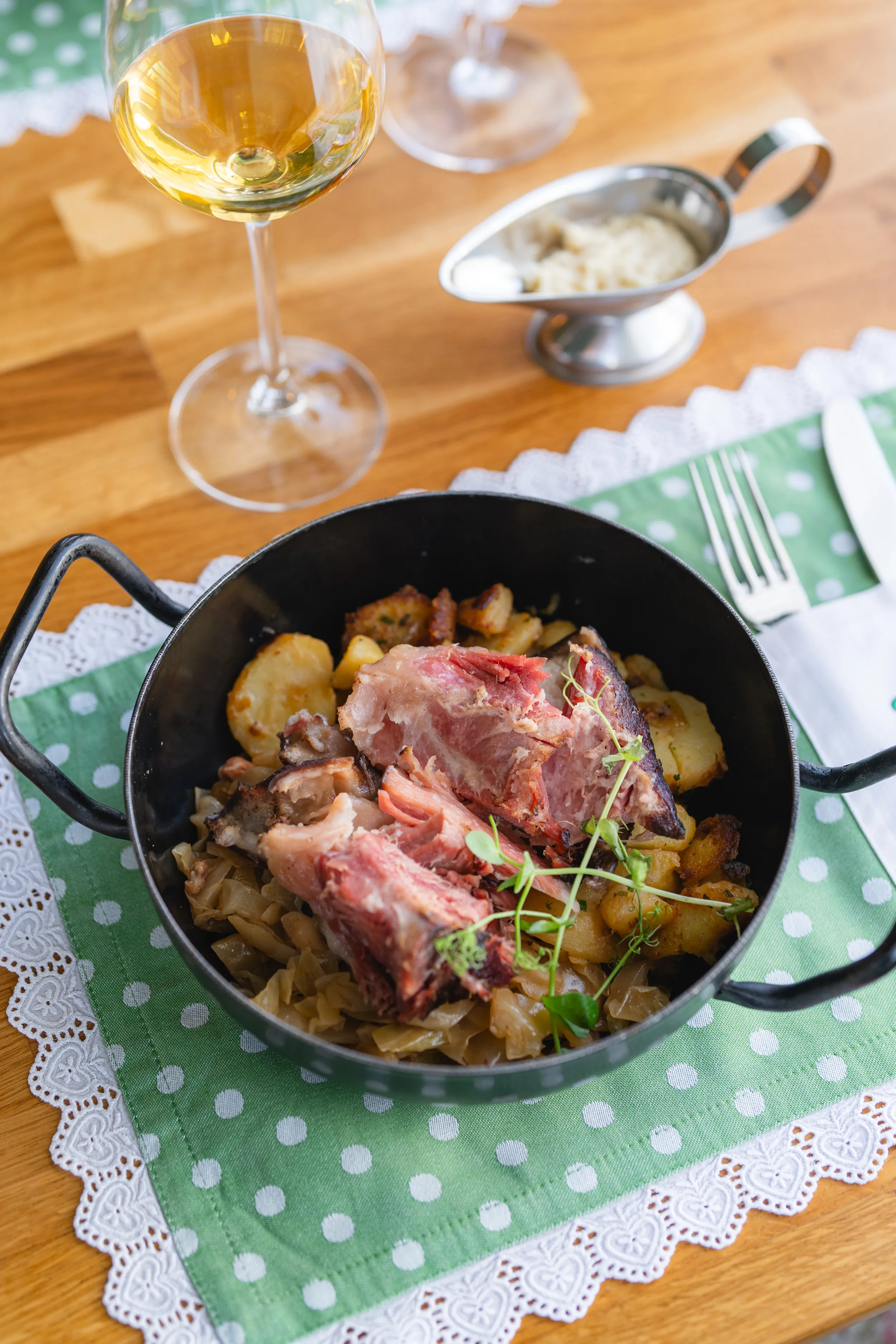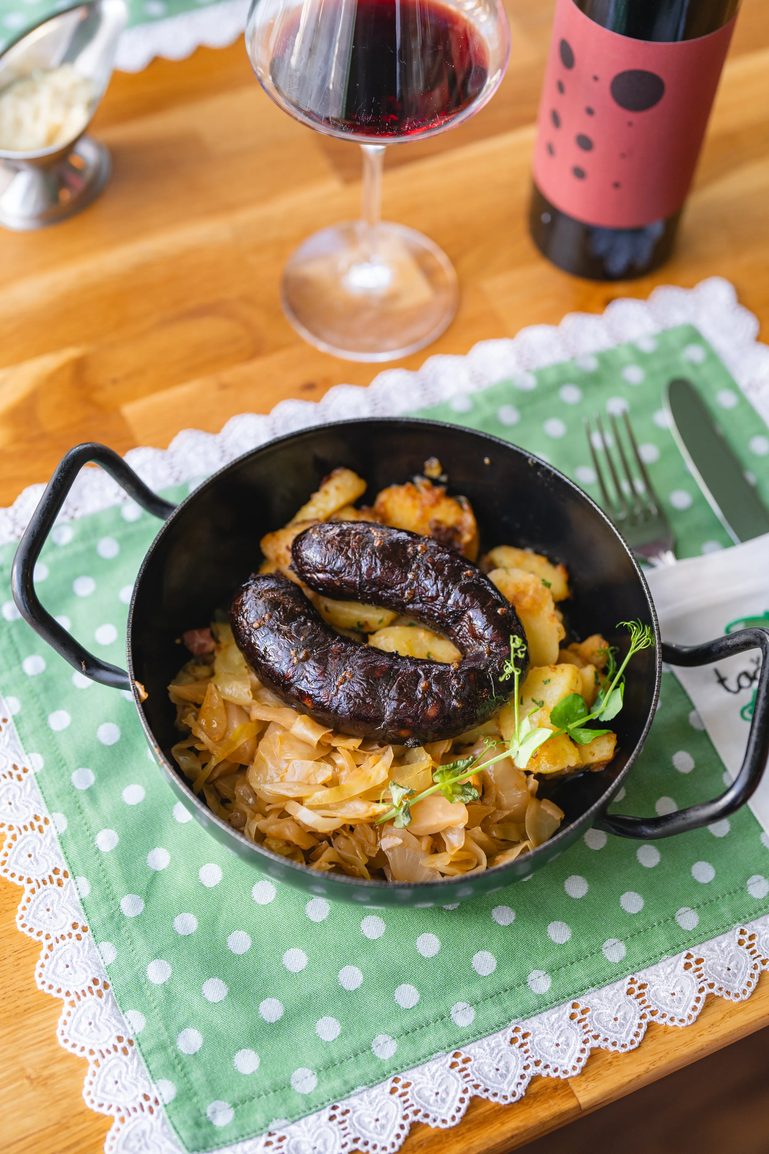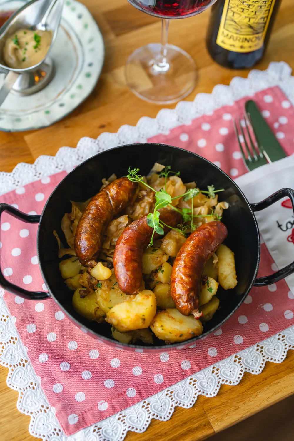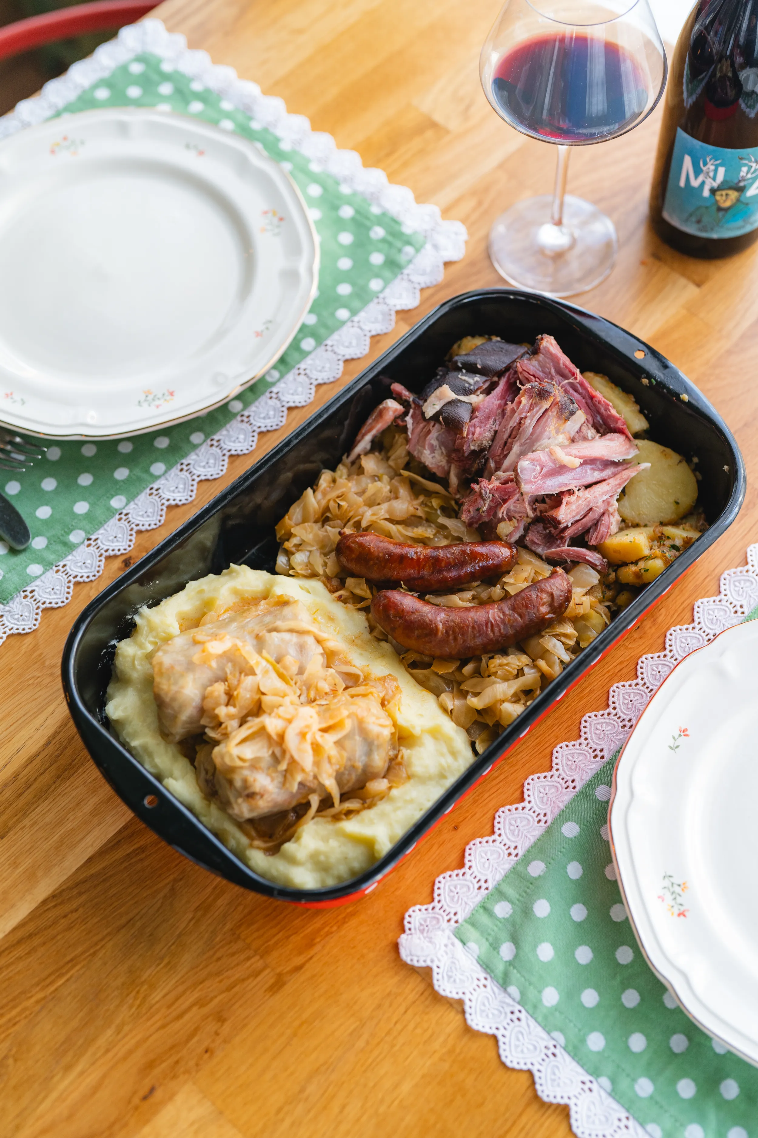 buncek, sarma, kobasice, restani krumpir, kiselo zelje, senf, hren