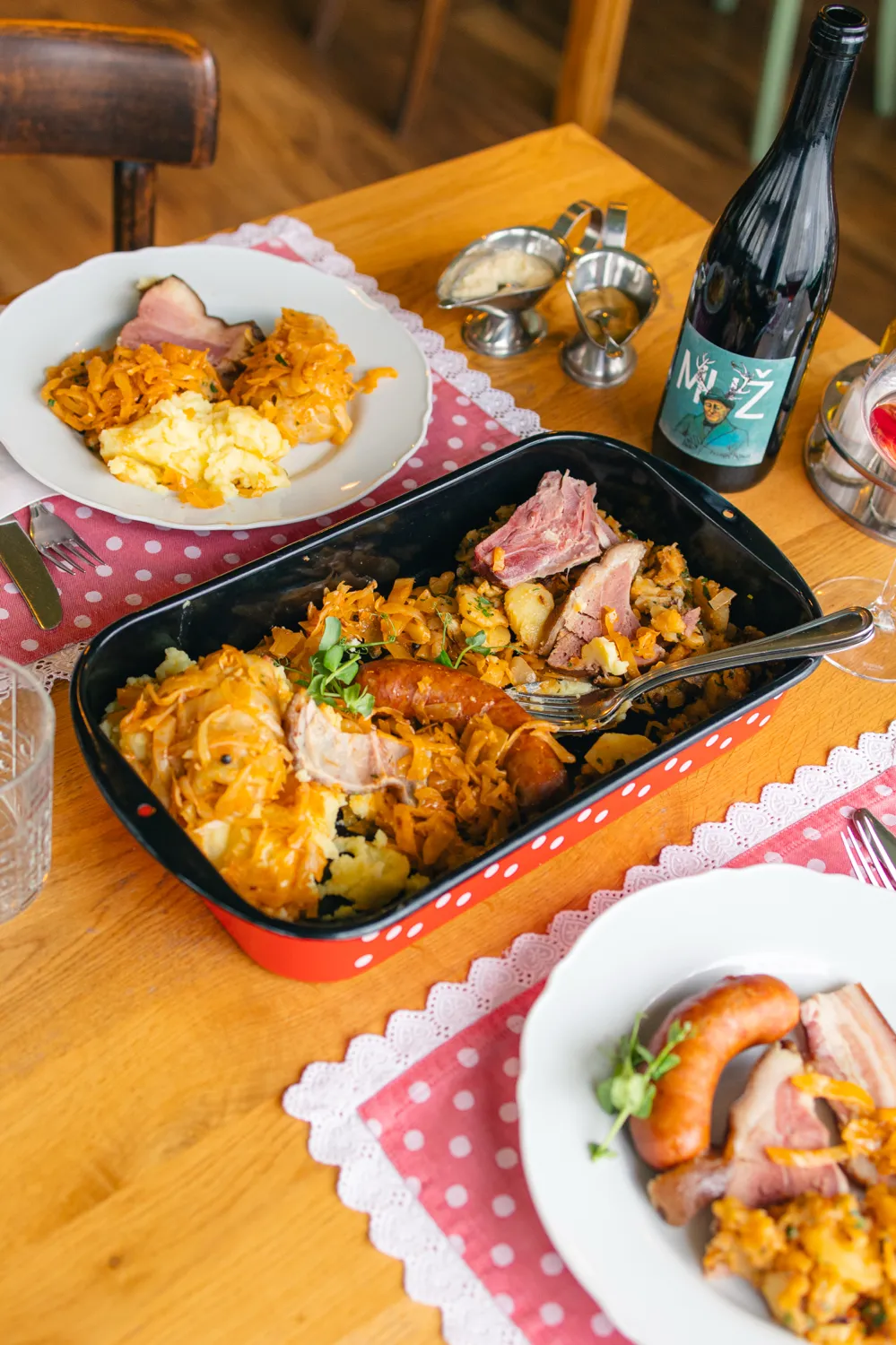 buncek, sarma, kobasice, restani krumpir, kiselo zelje, senf, hren